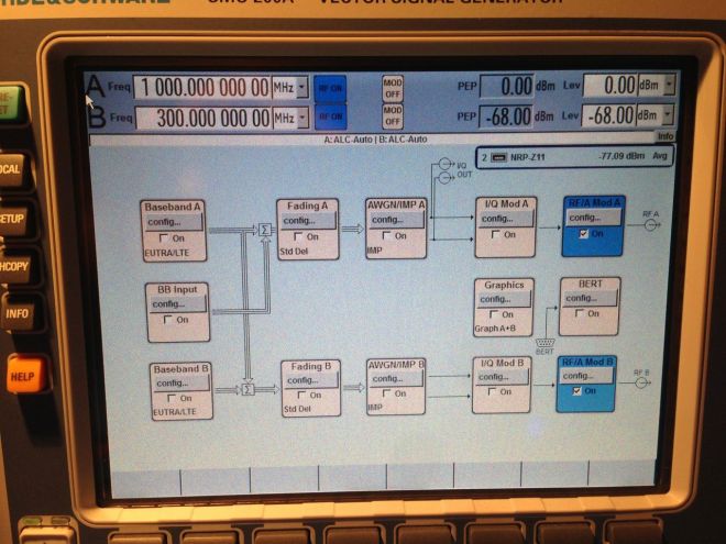 該例子中一臺(tái)R&S®SMU200A 矢量信號發(fā)生器生成了兩種電信標(biāo)準(zhǔn)的信號:在上行鏈路生成了一個(gè)LTE信號和加性噪聲,在下行鏈路生成了一個(gè)衰落Wcdma信號